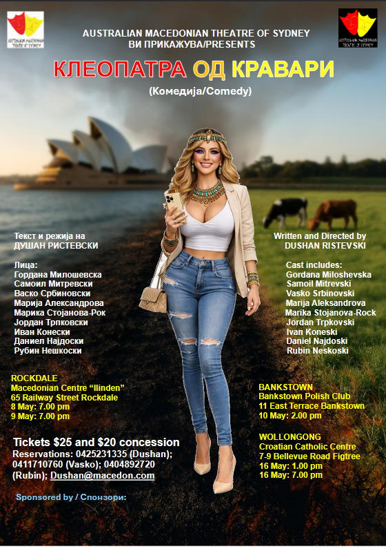 Австралиско македонскиот театар од Сиднеј за македонската заедница ја припреми најновата драмска продукција – комедијата „КЛЕОПАТРА ОД СЕЛО КРАВАРИ“. Автор и режисер на преставата е Душан Ристевски.