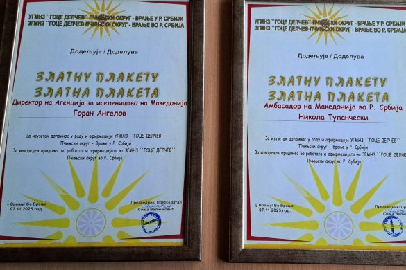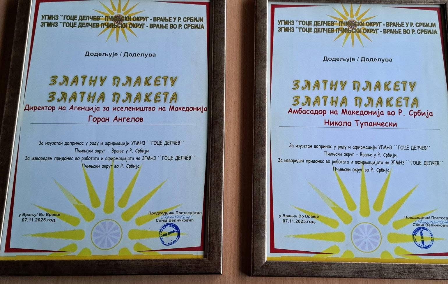 Раководството на Здружението на граѓани од Македонското Национално Малцинство “Гоце Делчев” Пчињски округ, Врање, на прославата по повод 20-годишниот јубилеј од своето постоење, на директорот на Агенцијата за иселеништво Горан Ангелов, му врачи “Златна плакета” за соработка и поддршката која Агенцијата ја дава на Македонската заедница од Врање!