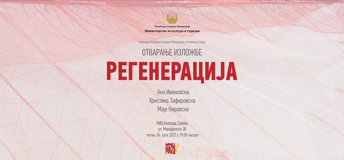 Во Културно-информативниот центар на Македонија во Белград, на 4 јули, во 19:00 часот ќе биде отворена групната изложба „Регенерација“, потпишана од македонски уметници – Ана Ивановска, Христина Зафировска и Маја Кировска. Настанот се одржува под покровителство на Министерството за култура и туризам на Република Северна Македонија и Амбасадата на Северна Македонија во Србија.
