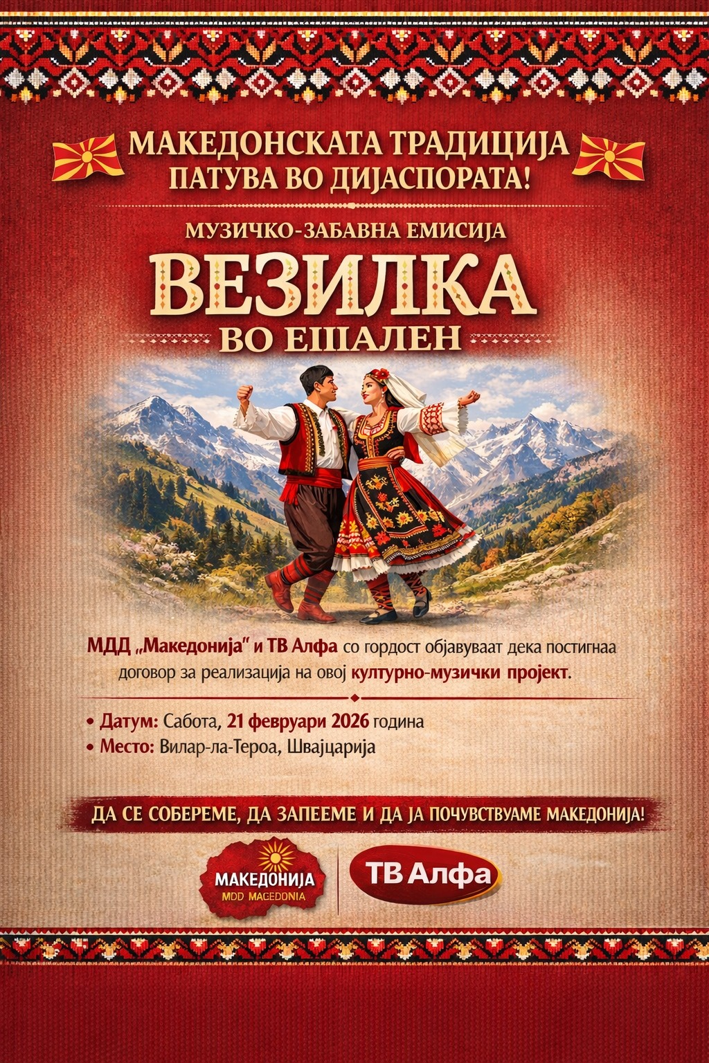 МДД „Македонија“ и ТВ Алфа со гордост објавуваат дека постигнаа договор за реализација на, МУЗИЧКО-ЗАБАВНАТА ЕМИСИЈА „ВЕЗИЛКА“ ВО ДИЈАСПОРАТА.