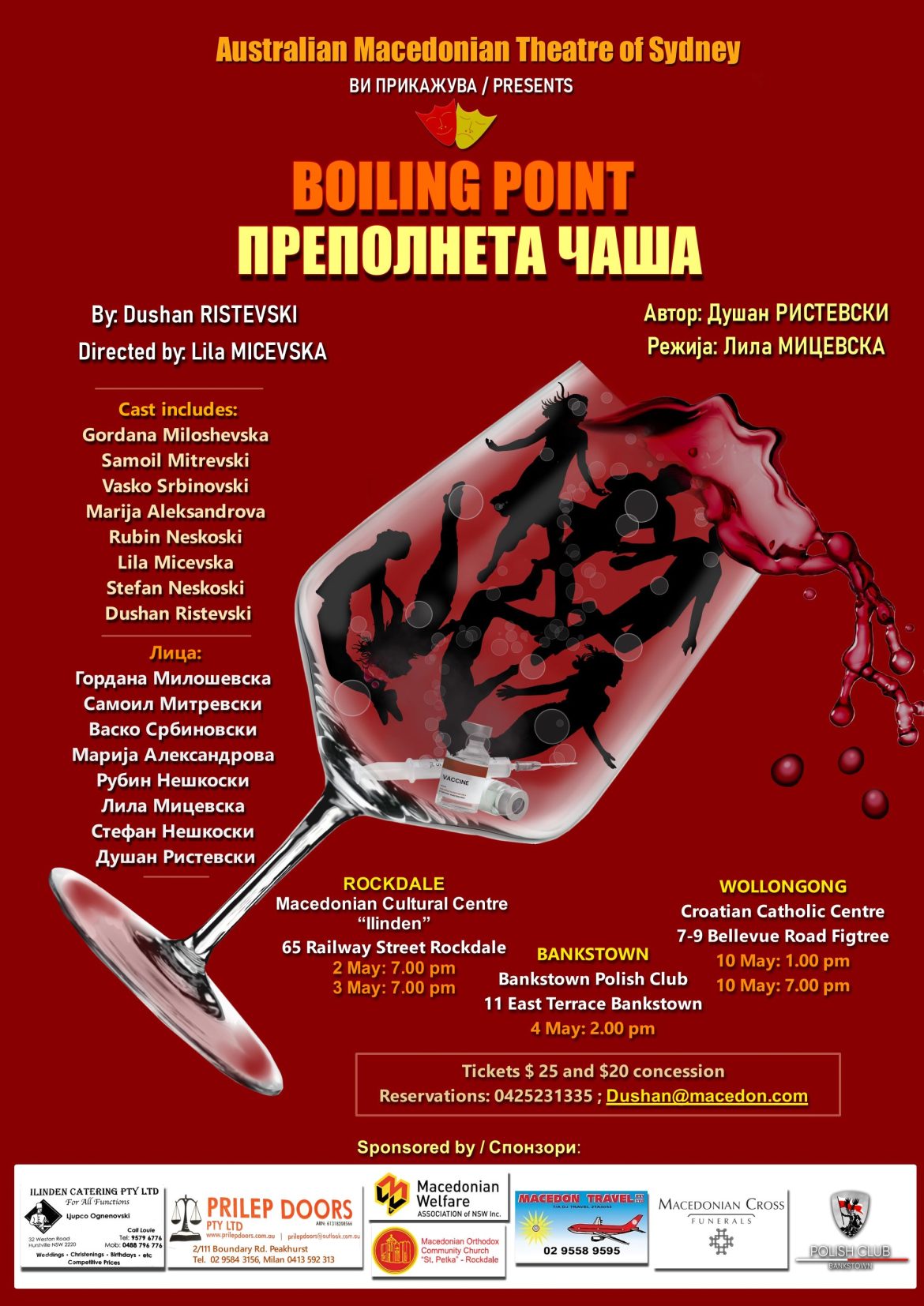 Австралиско македонскиот театар од Сиднеј за македонската заедница ја подготви најновата драмска продукција „Преполнета чаша“ од Душан Ристевски, во режија на Лила Мицевска. Сценските изведби се најавени за 2 и 3 мај во Рогдаел, 4 мај во Бенкстаун и на 10-ти мај со две изведби во градот Волонгонг. Оваа продукција се реализира неколку години по радио драмата „Локдаун“ што се промовираше во почетокот на 2022 година.