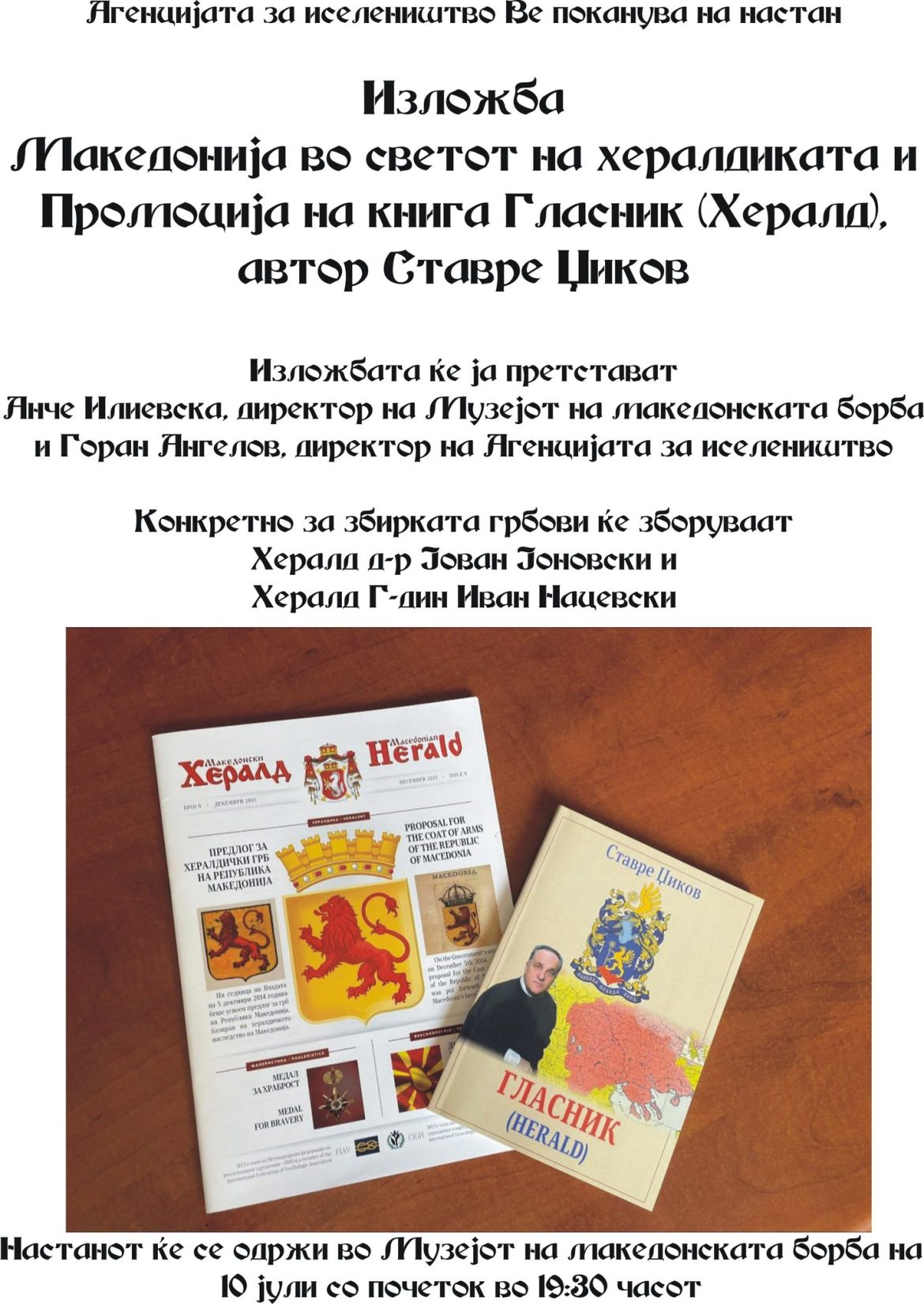Агенцијата за иселеништво ве поканува на настан Изложба, Македонија во светот на хералдиката и Промоција на книга „Гласник (Хералд), автор Ставре Џиков Настанот ќе се одржи во Музејот на македонската борба на 10 јули со почеток во 19:30 часот.