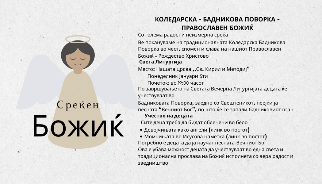 Иселенички СтраниСАД Покана за традиционална Коледарска Бадникова Поворка by Stanela S јануари 5, 2026 јануари 5, 2026 12 views 12 Сподели 0 FacebookTwitterPinterestEmail previous post Придружете ни се на 3ти јануари за незаборавна ноќ со Spasen Siljanovski next post Среќна Нова година ви посакува ИЗВОР Муртен и КУД ИЗВОР Дополнително прочитај и за: КУД Македониум започнува со уписи за деца на возраст од 7 до 12 години јануари 5, 2026 Оглас за учество во антологија јануари 5, 2026 Претстојни настани во Св. Климент Охридски јануари 5, 2026 „Македонија“ – декемвриско-јануарско празнично издание јануари 5, 2026 Прослава на Божиќ во Осиек јануари 5, 2026 Енис Хилми член на Управниот одбор на ZemaF – Zentrum der mazedonischen Frauen e.V.... јануари 5, 2026