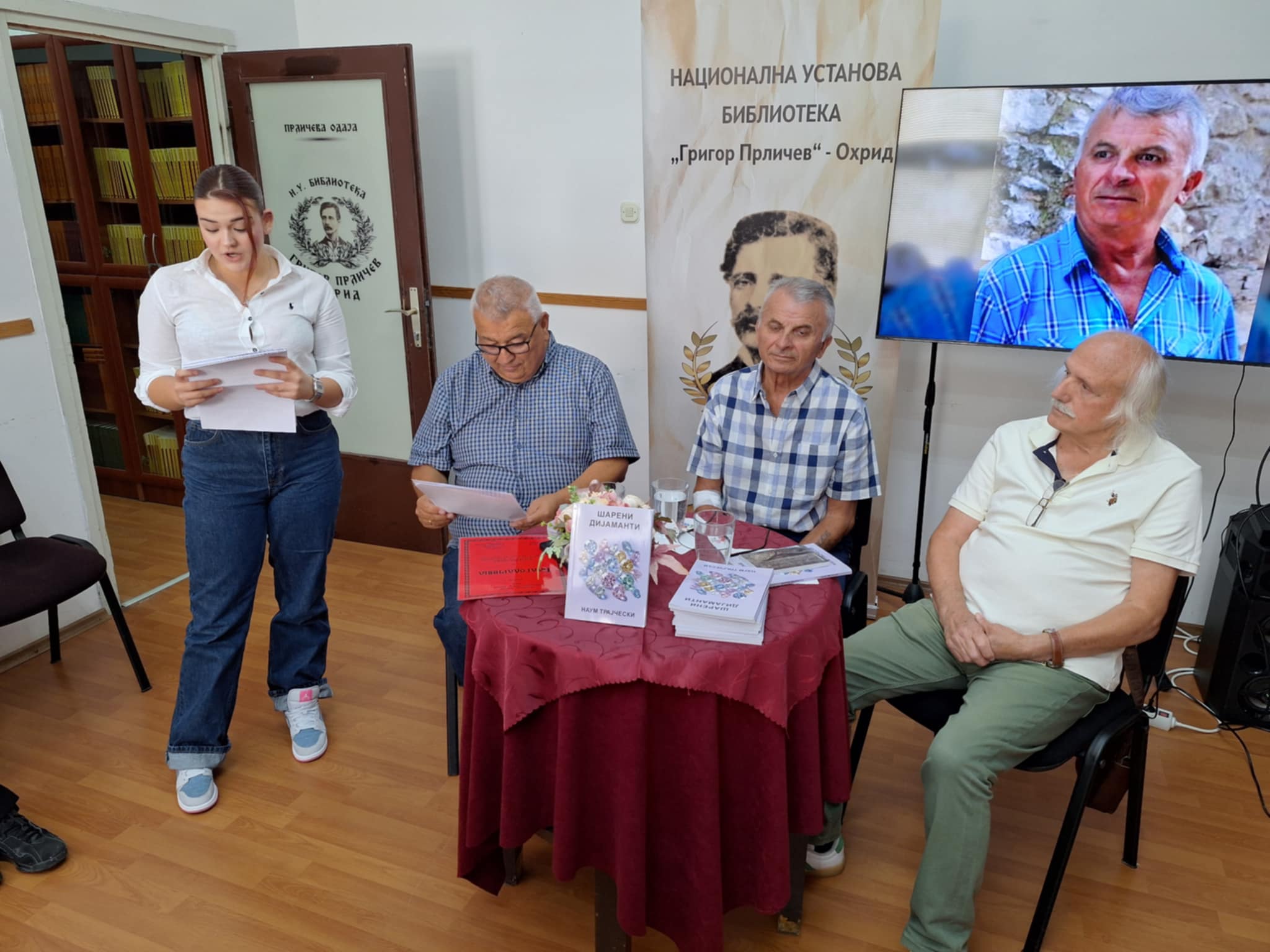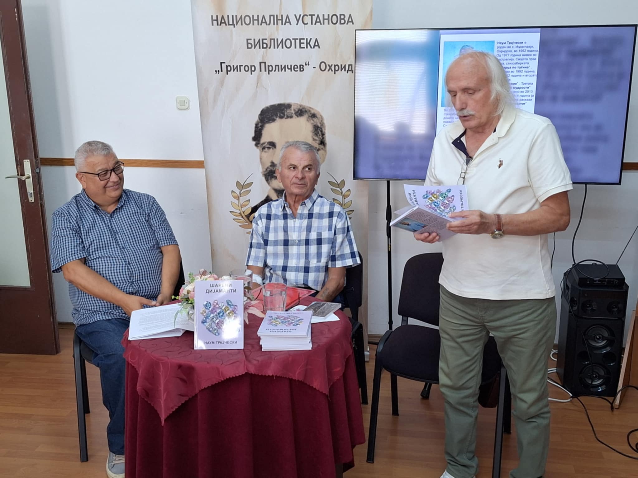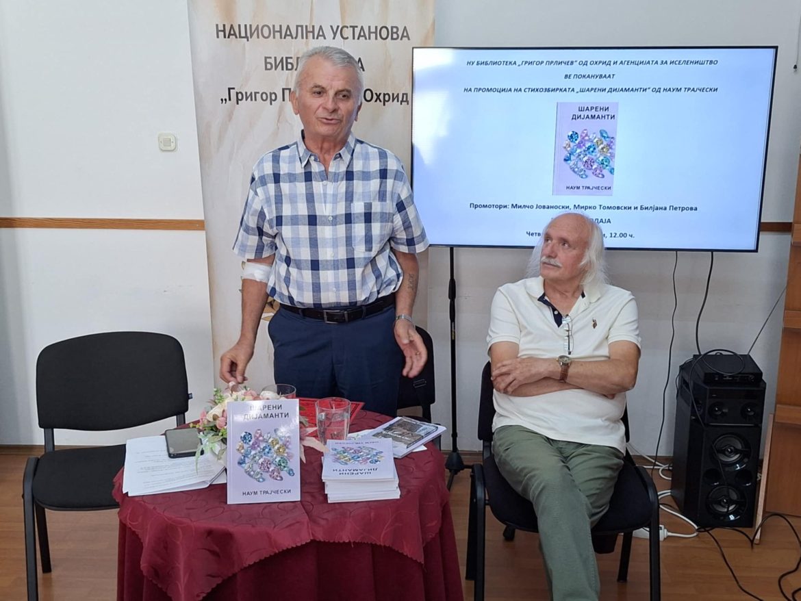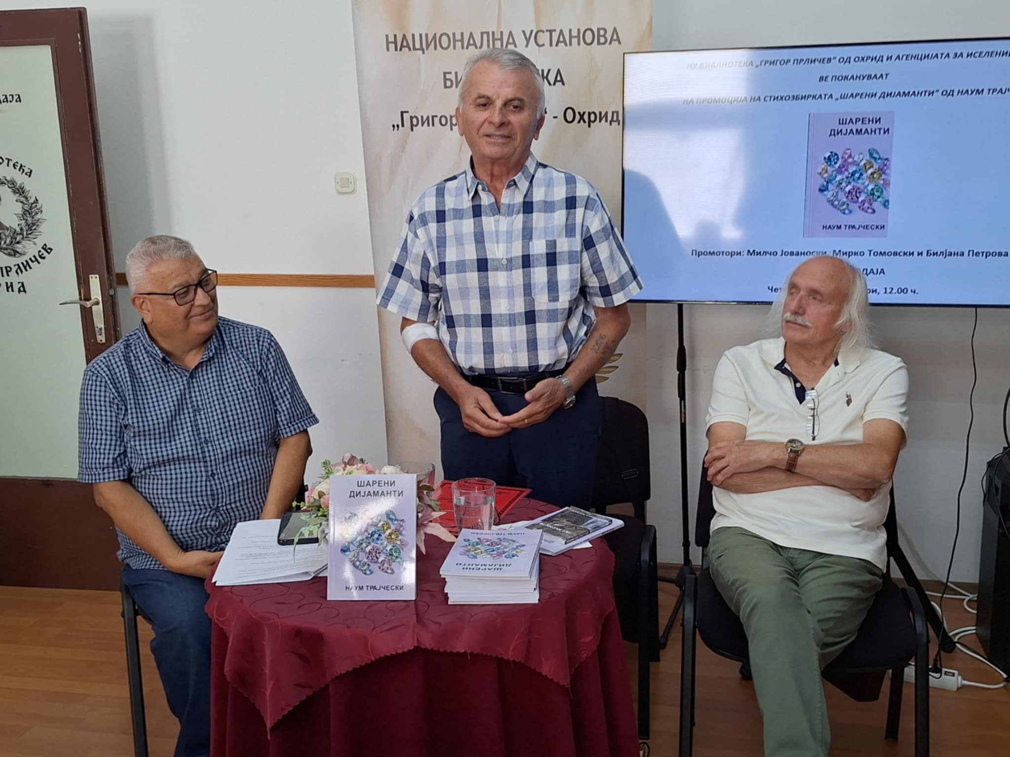 Од денешната промоција на стихозбирката ШАРЕНИ ДИЈАМАНТИ од роднокрајниот автор Наум Трајчески. Издавач на книгата е Агенцијата за иселеништво а на промоцијата присуствуваа директорт на агенцијата Горан Ангелов и Билјана Костова,раководител на секторот за унапредување и одржување на врските со иселениците.