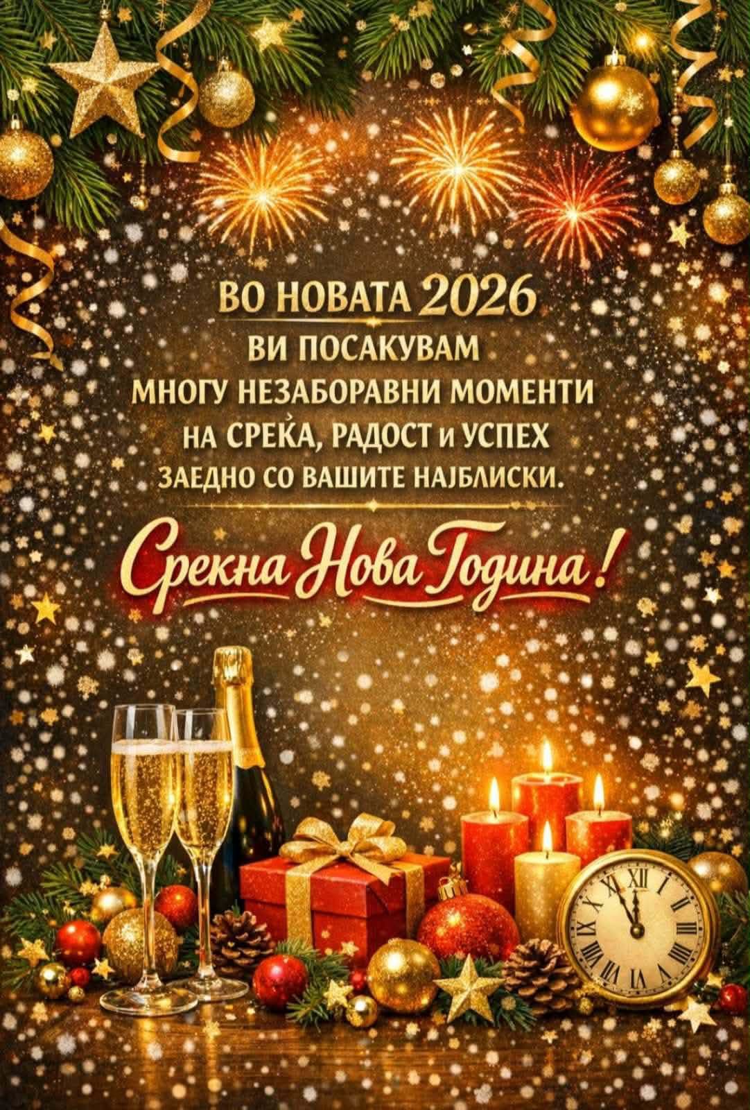 Нека Бог ви дарува Здравје Среќа, Мир, Љубов Слога и Успеси во Новата година.