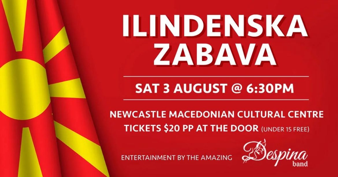 Дојдете да го прославиме Илинден во Македонскиот културен центар Њукасл. Настап на Деспина Бенд. Билети 20$ по лице на врата (под 15 години бесплатно). Контактирајте со Петар Драгарски 0414 223 214 или Даниел Илиевски 0438 032 101 за да закажете.