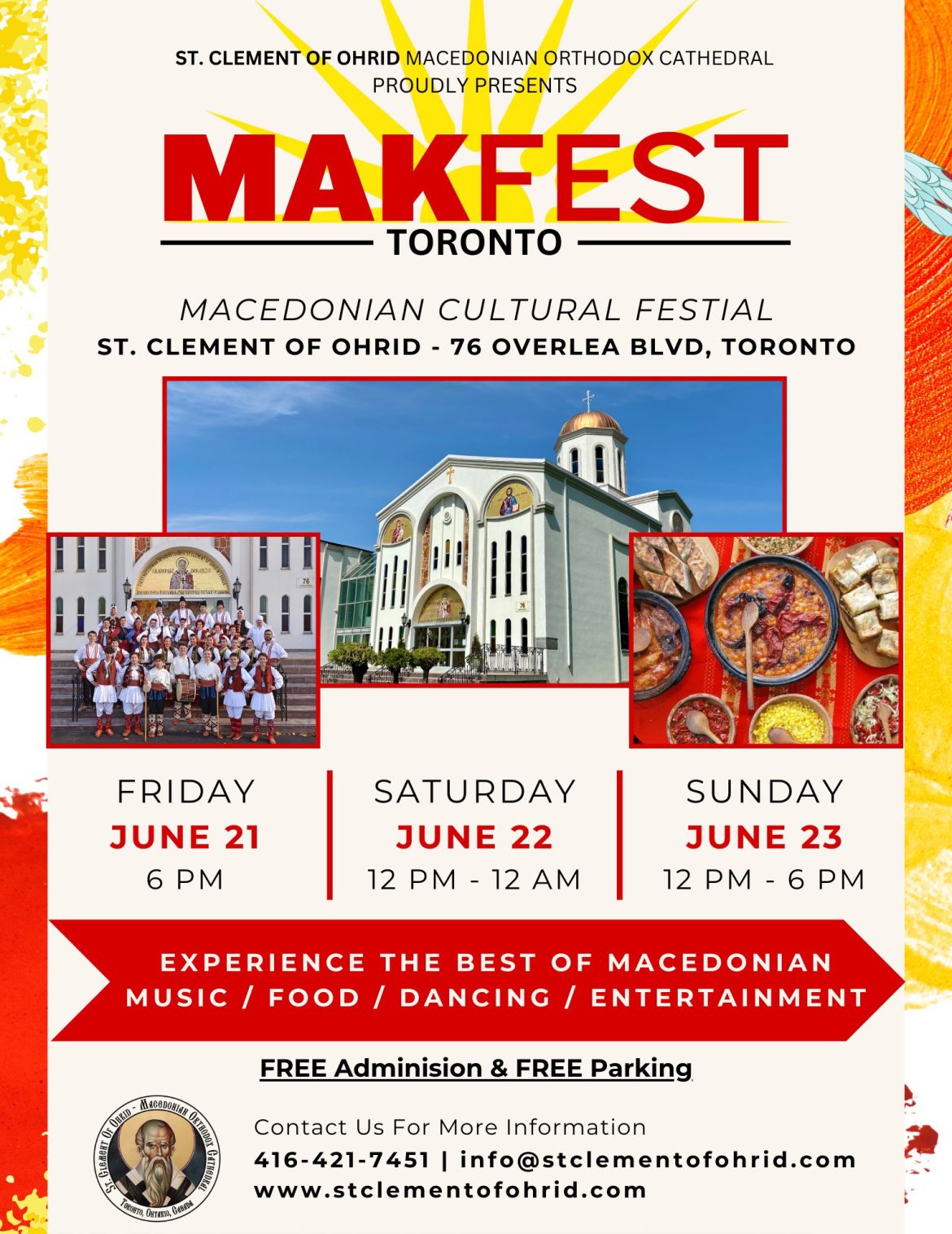 Со задоволство објавуваме дека се враќа летниот Македонски фестивал на Свети Климент Охридски! Придружете ни се од петок, 21 јуни до недела, 23 јуни на прекрасна македонска музика, храна, играње и забава. Повеќе детали ќе објавиме во наредните недели!
