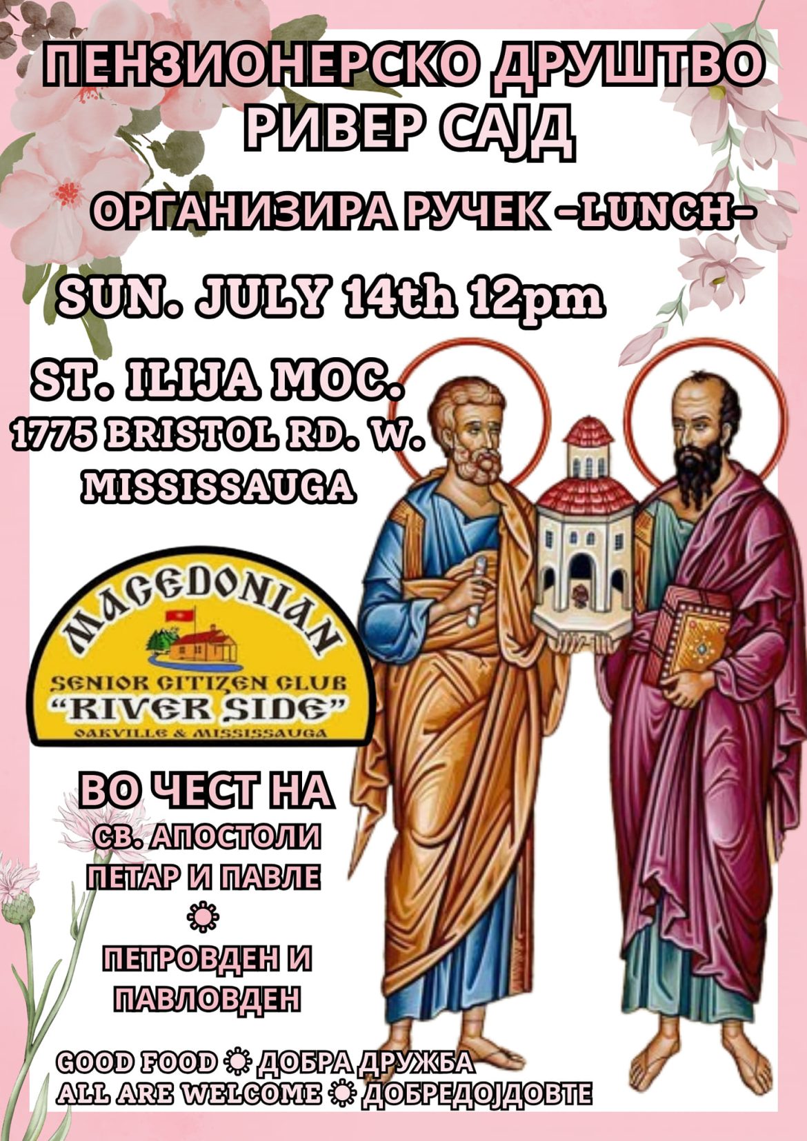 Во чест и слава на Св. Апостоли, Св. Петар и Павле, во недела 14 јули после светата литургија пензионерското друштво “Ривер сајд” МПЦ Св. Илија, Мисисага ќе припреми ручек. Сите сте поканети и добредојдени. Нека ни се напомош Петровден и Павловден. Дојдете заеднички да ги одбележиме.![]()